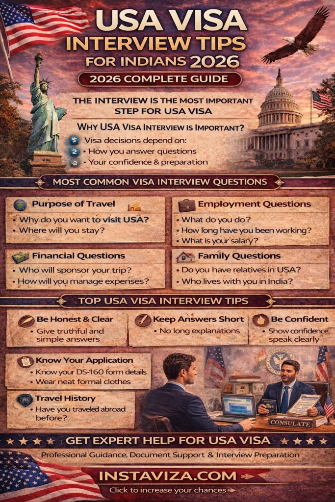 In this complete guide, you will learn the best USA visa interview tips for Indians in 2026, including common questions, how to answer them, and expert strategies to improve your chances of approval.